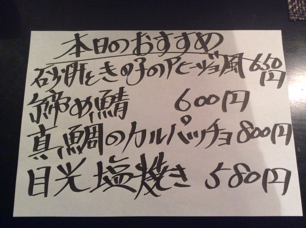 本日のおすすめには私の大好物の砂肝を使った「砂肝ときの子のアヒージョ風」がございます🍀他にも人気商品である「目光塩焼き」など多くのおすすめをご用意してお待ちしております😊